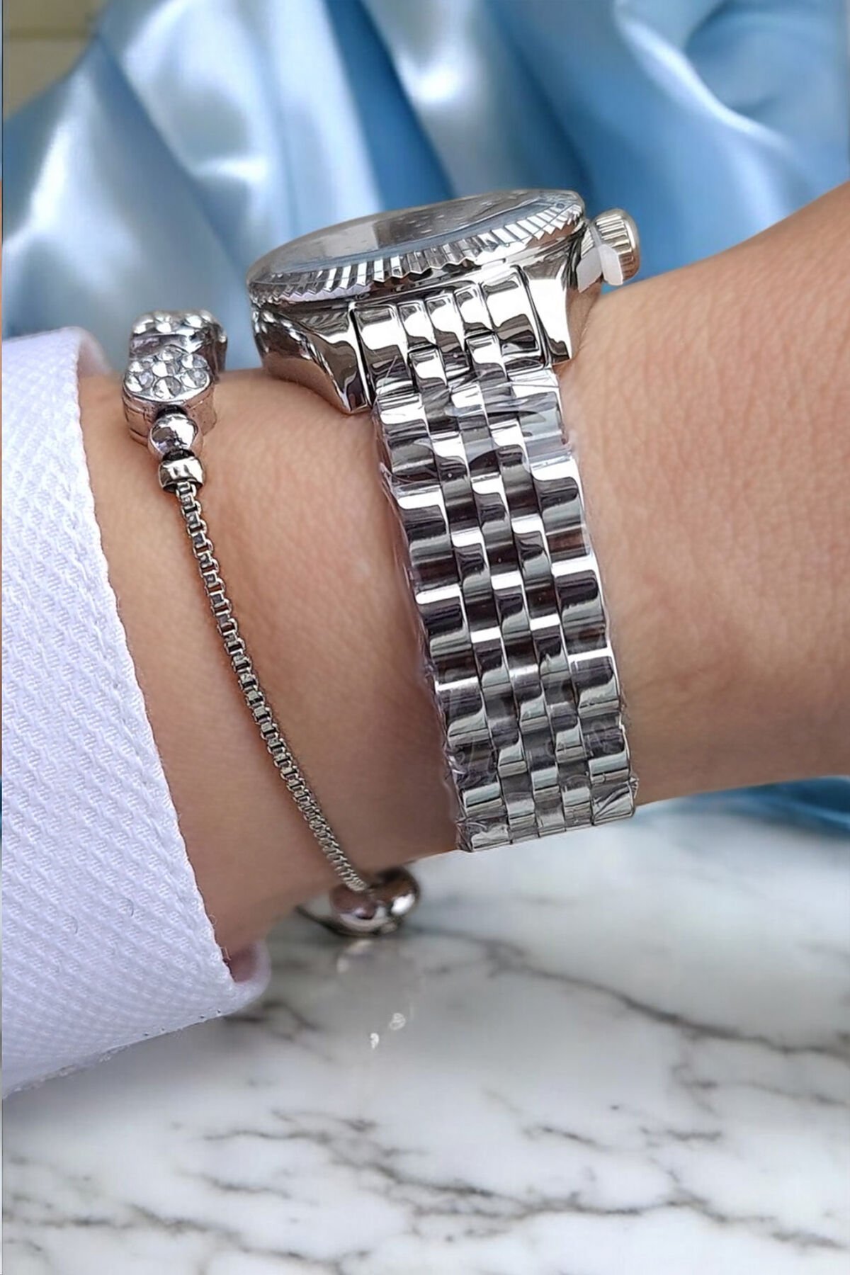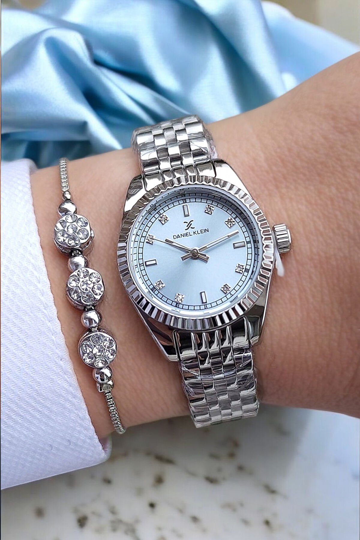 27 mm Mini Kasa Açık Mavi Kadranlı Metalik Şık Kadın Kol Saati, Taşlı Bileklik Hediyeli