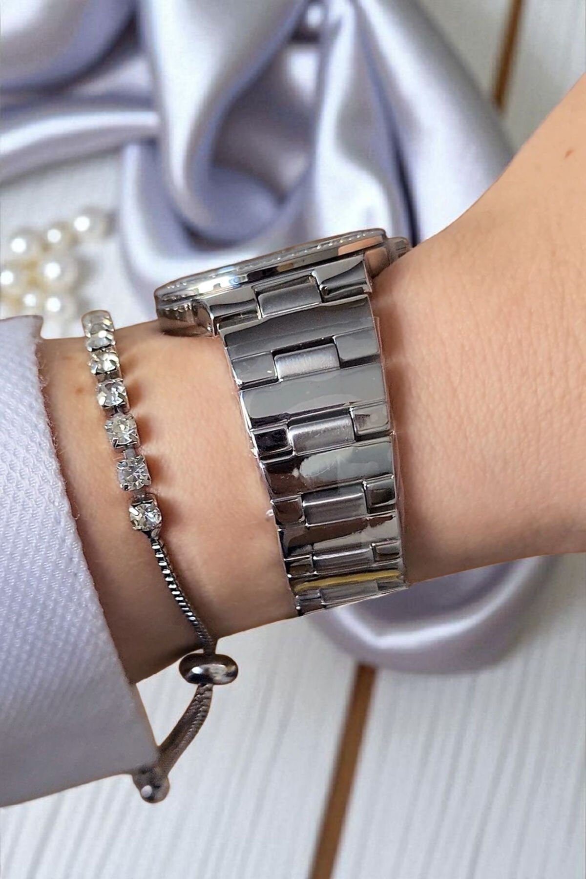 31 mm, Taşlı, Çelik Kordon Metalik Zarif Kadın Kol Saati, Taşlı Bileklik Hediyeli