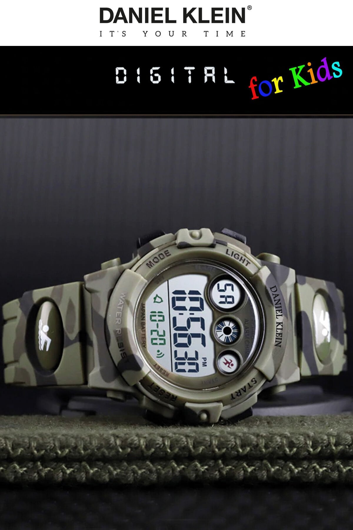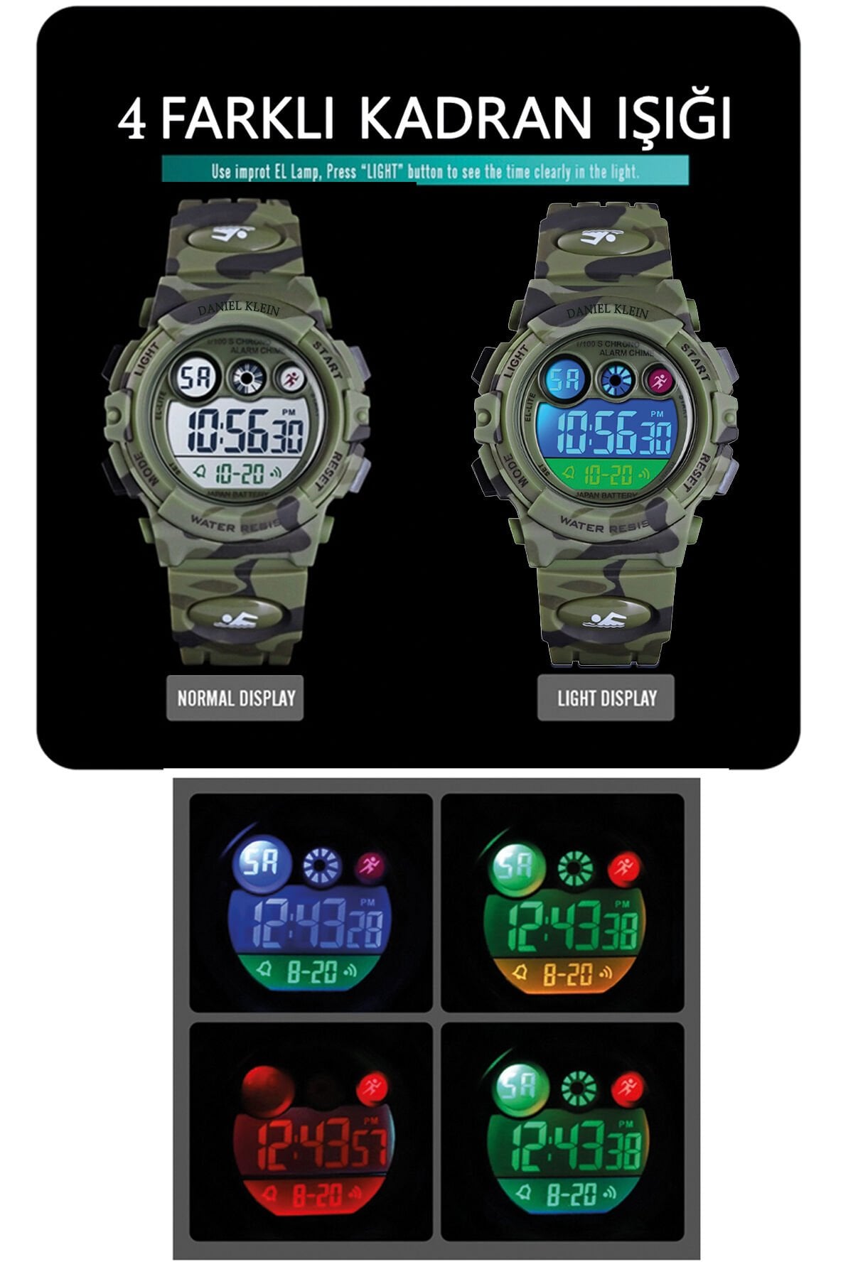 4 Farklı Işıklı, Alarmlı, Kronometreli Asker Yeşili Kamuflaj Erkek Çocuk Kol Saati (5-10 Yaş)