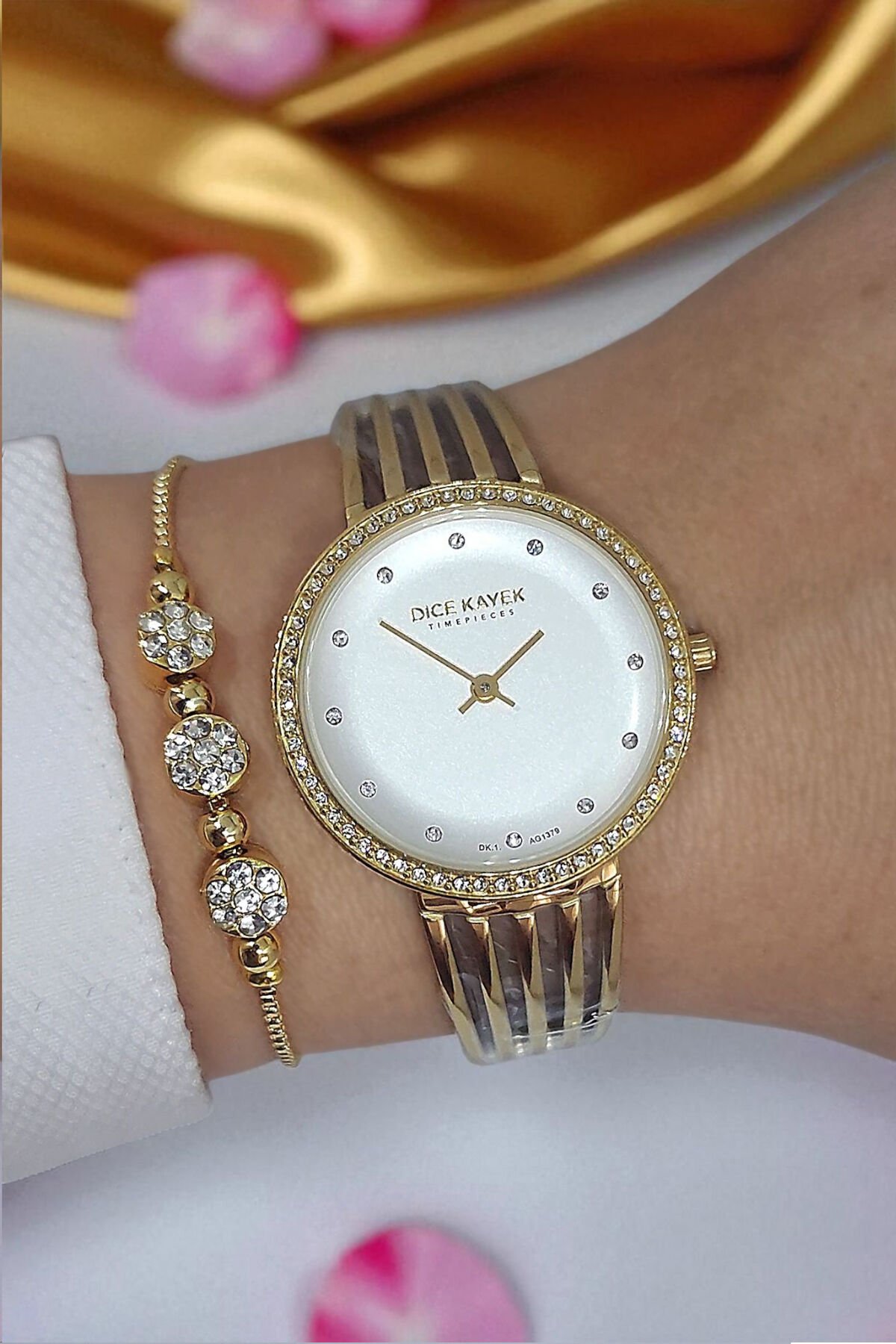 5 ATM Su Geçirmez Beyaz Kadran Altın Sarısı Taşlı Kadın Kol Saati, Taşlı Bileklik Hediyeli
