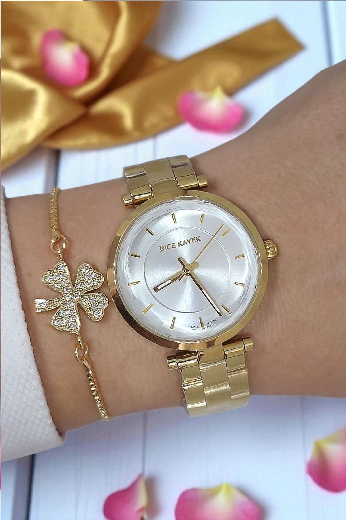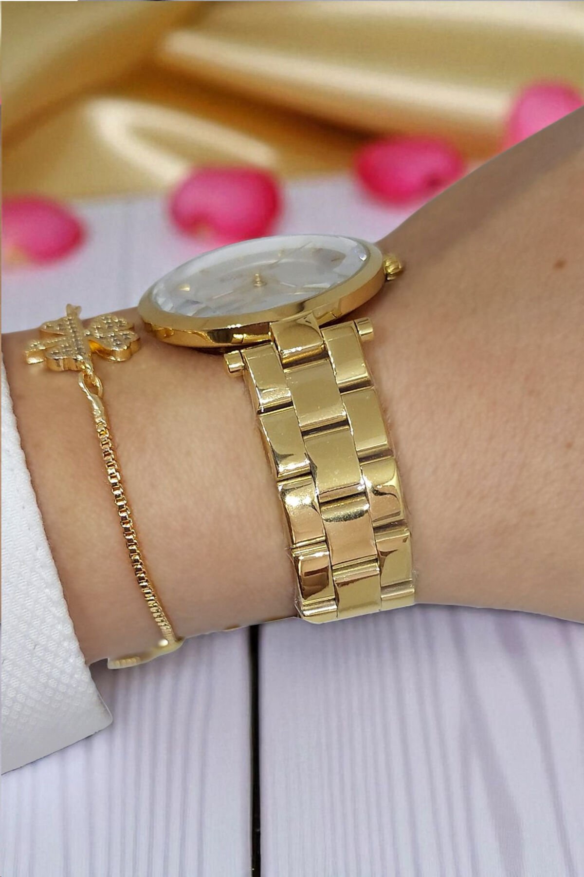 5 ATM Su Geçirmez Metalik Kadran Çelik Zarif Altın Sarısı Kadın Kol Saati, Taşlı Bileklik Hediyeli
