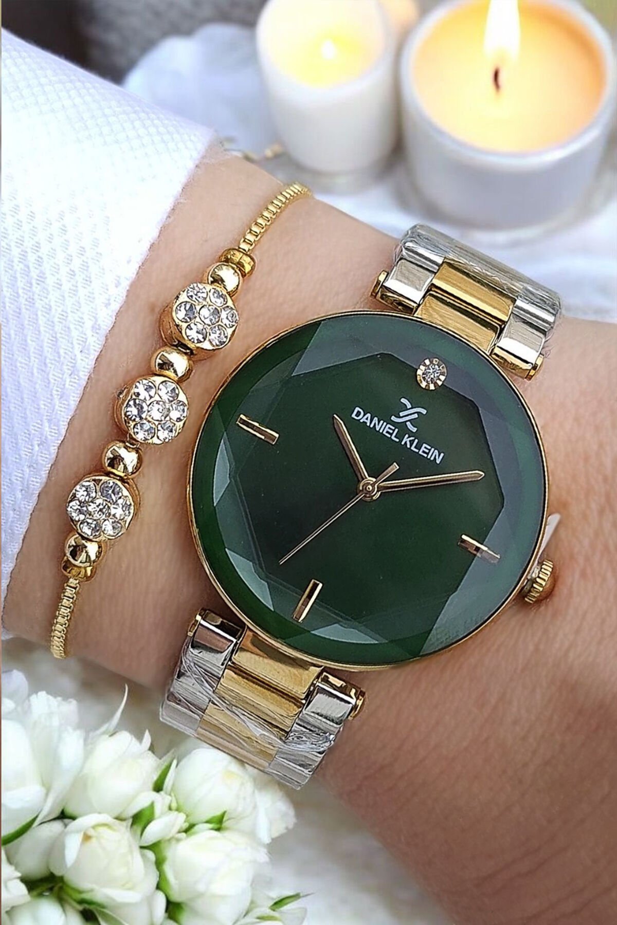 Kesme Camlı Çelik Bilezik Altın/Metalik Yeşil Kadran Kadın Kol Saati - Zirkon Taşlı Bileklik Hediye Kesme Camlı Çelik Bilezik Altın/Metalik Yeşil Kadran Kadın Kol Saati - Zirkon Taşlı Bileklik Hediye DK.1.13465.8