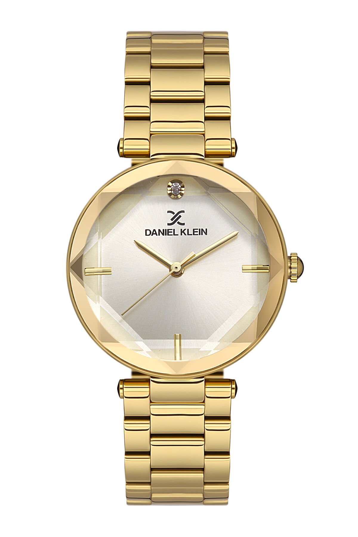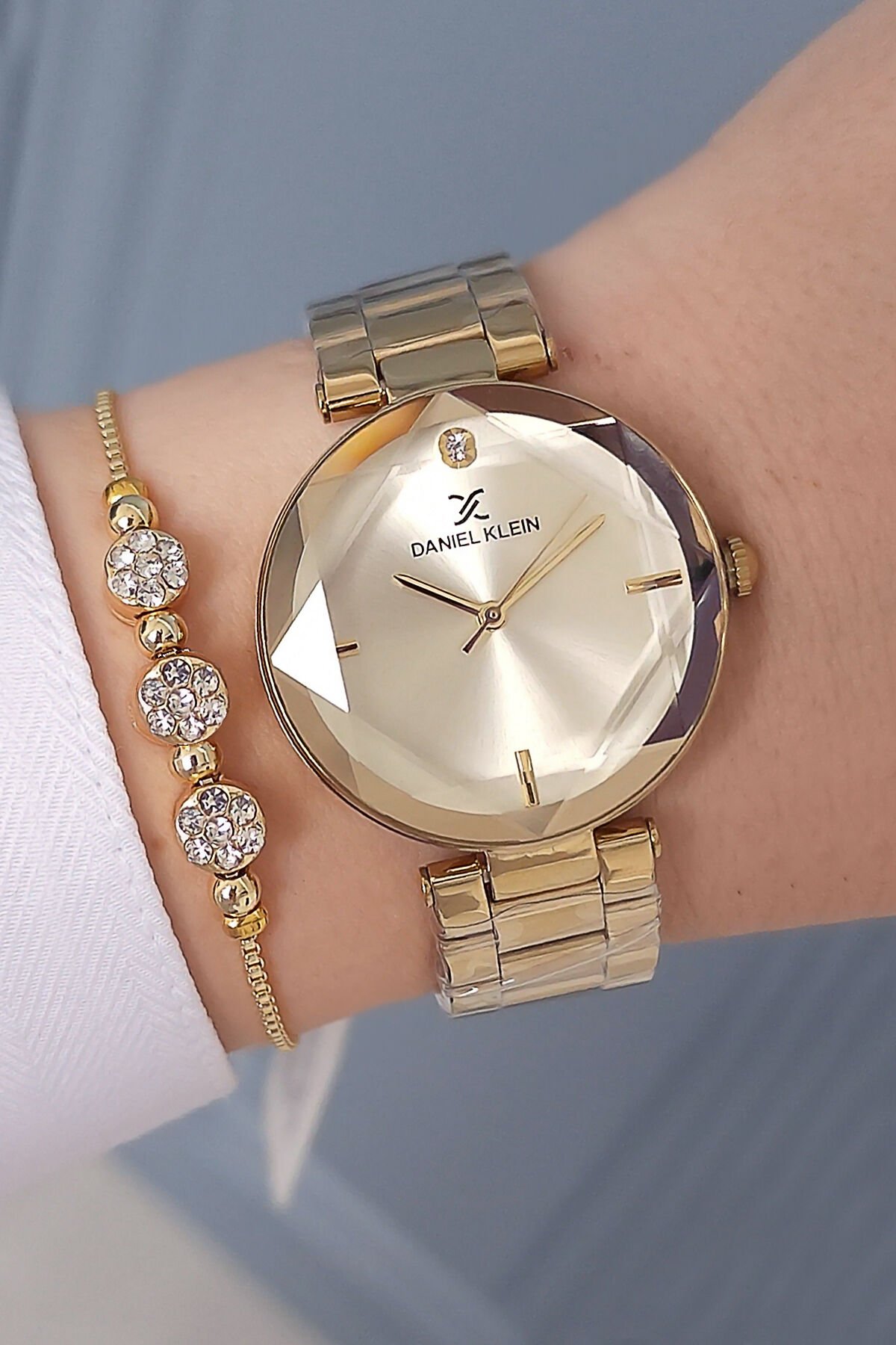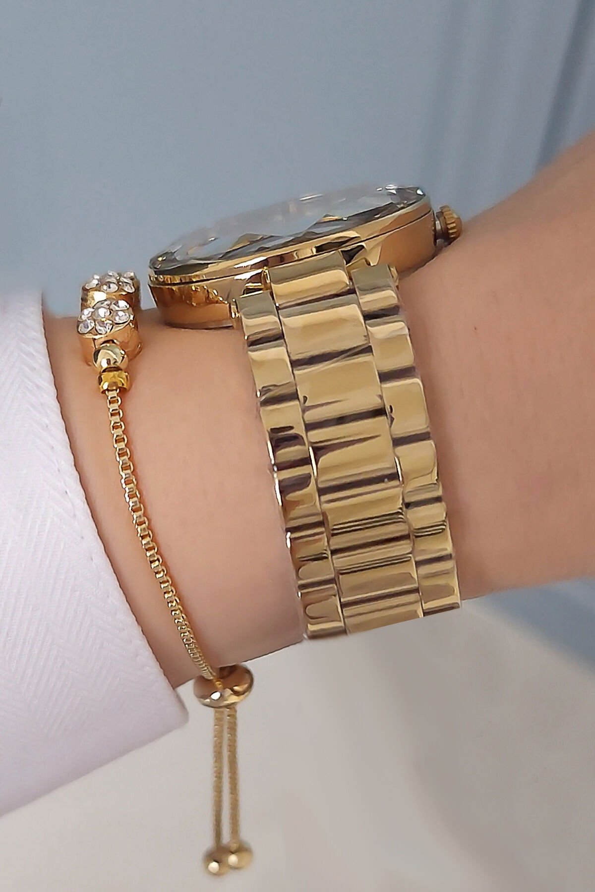 Kesme Camlı Çelik Bilezik Altın Sarısı Kadın Kol Saati - Zirkon Taşlı Bileklik Hediyeli