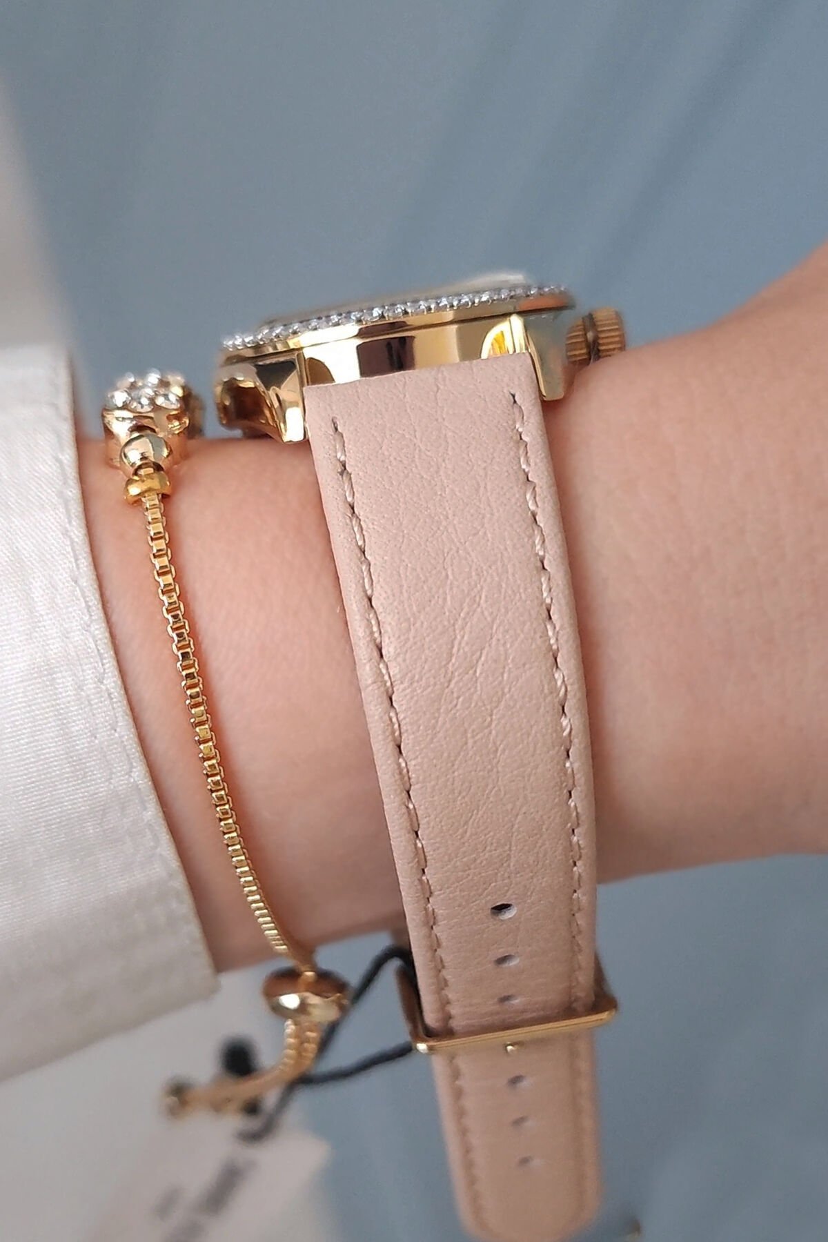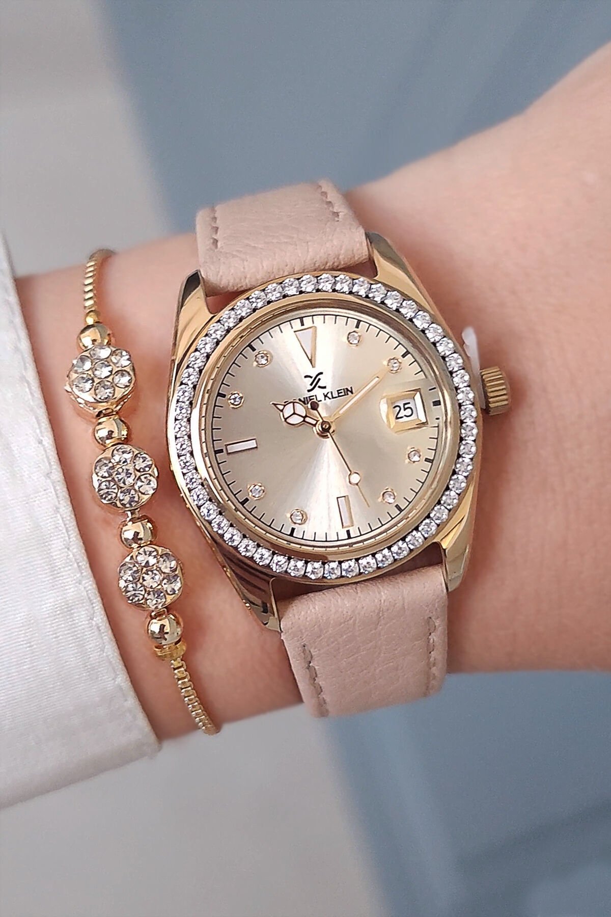 Takvimli, Altın Sarısı Taşlı Kasa Krem Deri Kayışlı Kadın Kol Saati, Taşlı Bileklik Hediyeli