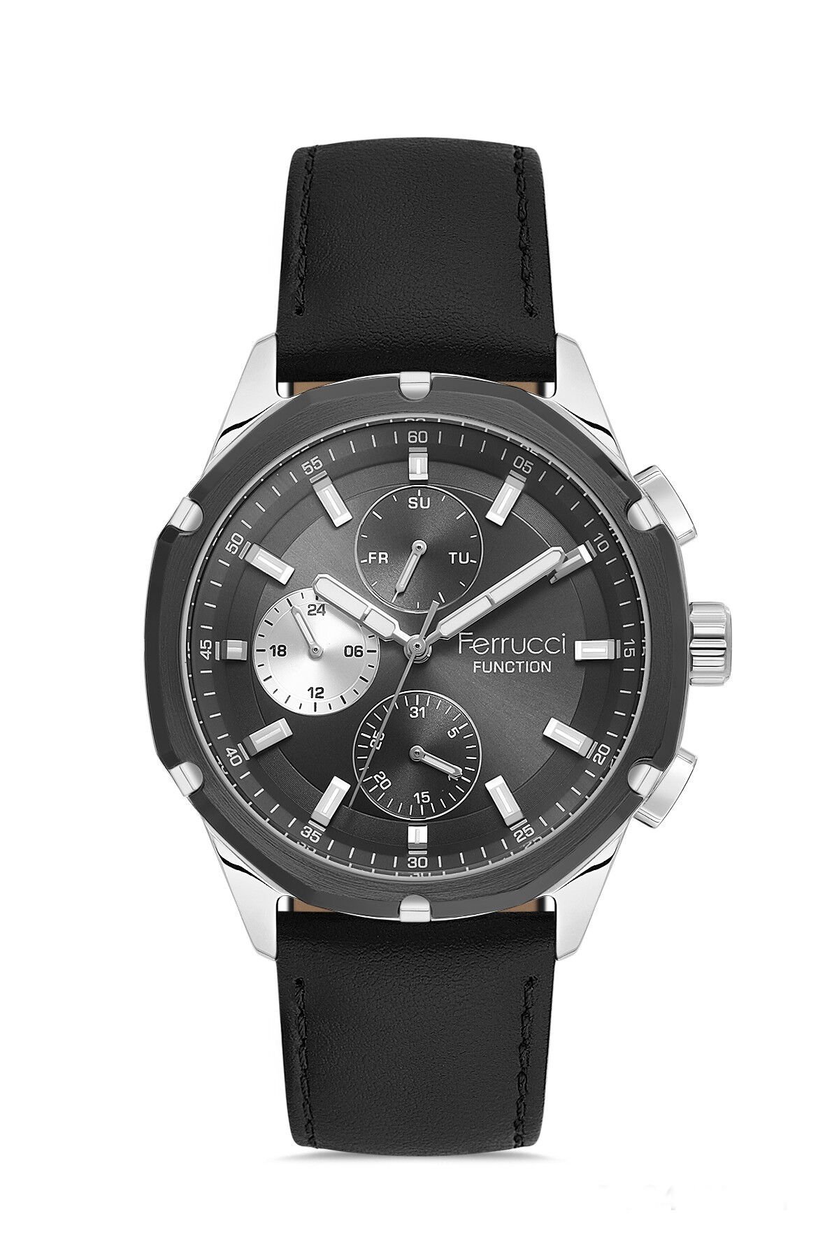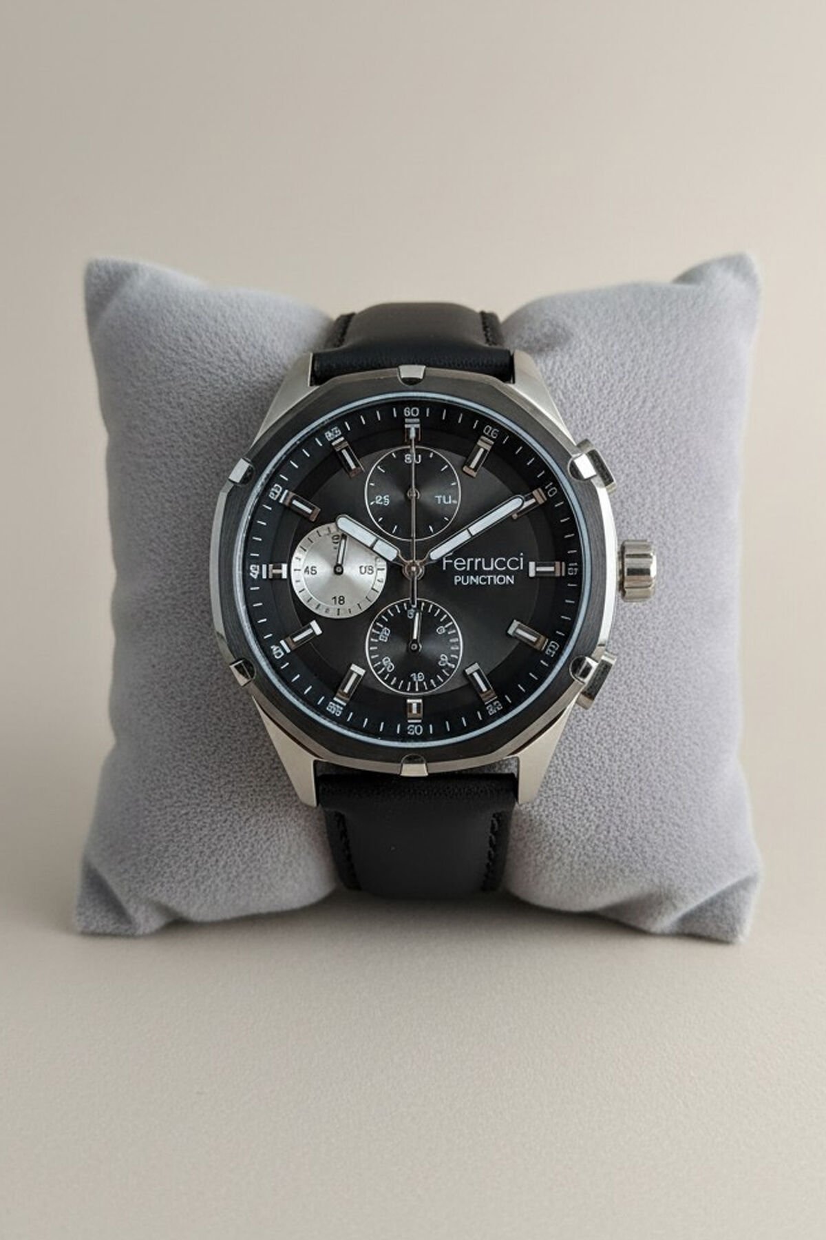 Marka: Ferrucci ; Çap: 44 mm ; Kasa Materyali: Metal ; Kordon Materyali: Deri Kayış ; Kasa Rengi:Gümüş ; Kordon Rengi: Siyah ; Kadran Rengi: Siyah ; Cam: Mineral ; Ekran Tipi: Analog ; Mekanizma: Pilli ; Suya Dayanıklılığı:3 ATM El/Yüz Yıkama ; Alarm: Yok ; Kronometre: Yok; Takvim: Yok ; 2 yıl Garanti Distribütör Firmamız ARIKAN güvencesiyle