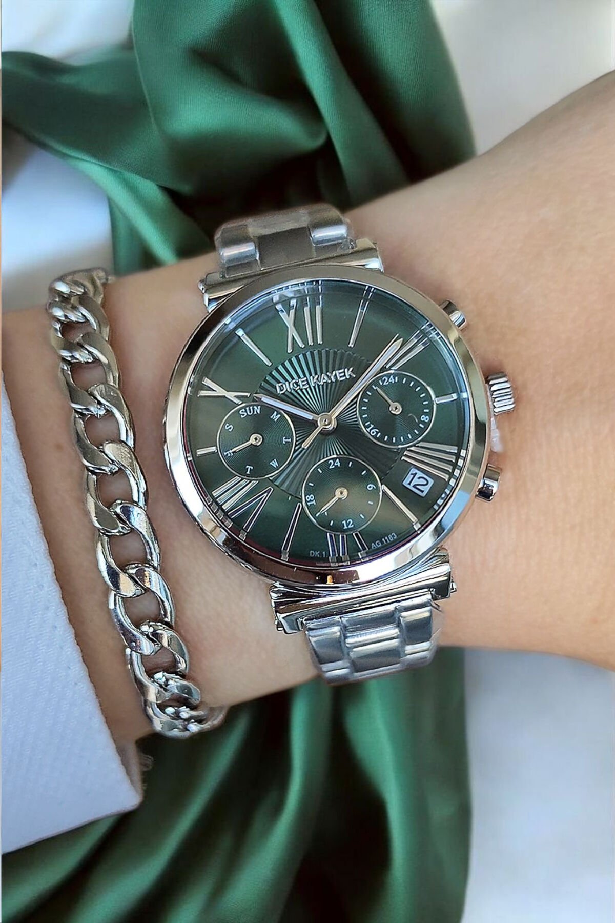 Tüm Fonksiyonları Aktif Takvimli 5ATM Su Geçirmez Yeşil Kadran Çelik Kadın Kol Saati Bileklik Hediye