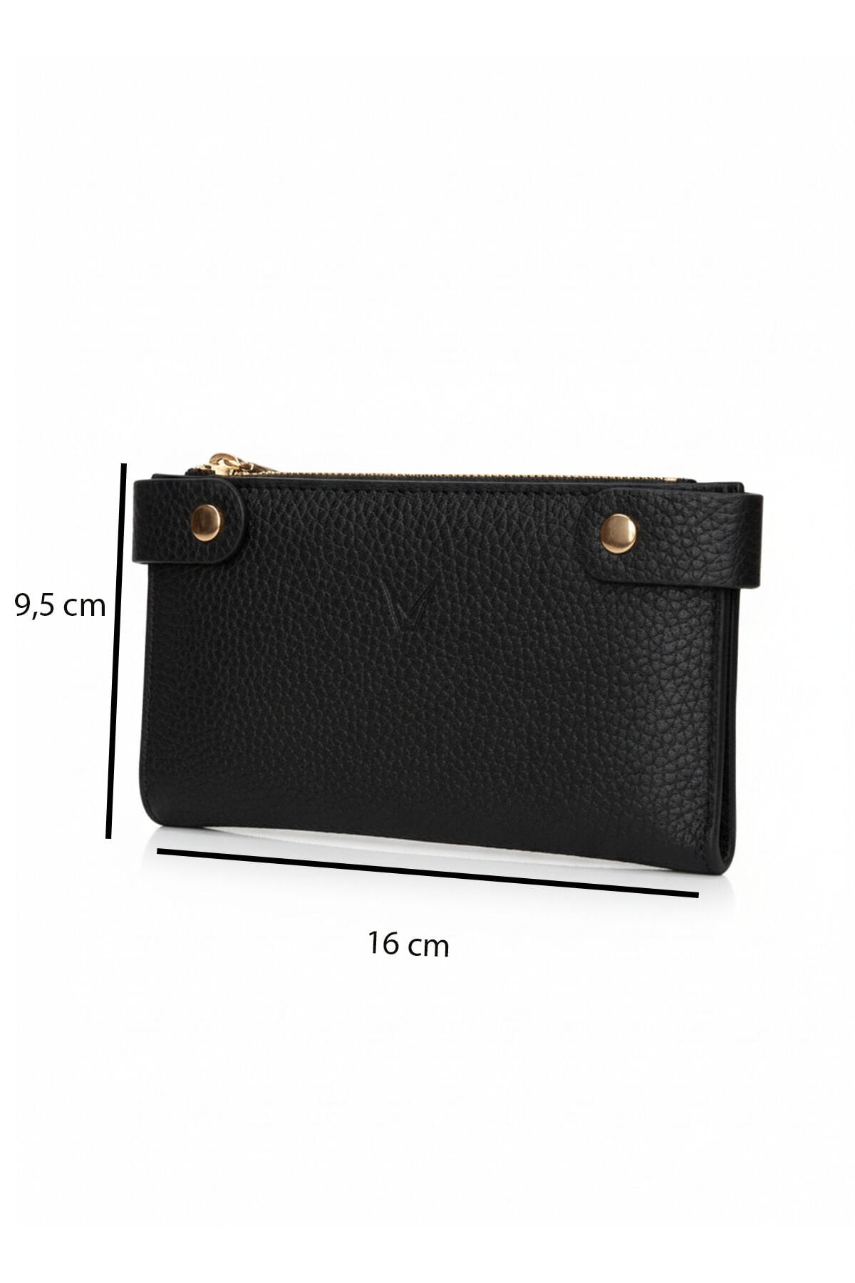 Fermuarlı bölmesi bozuk para ve küçük eşyalar için pratik kullanım sağlar. Kompakt yapısı sayesinde çanta içerisinde rahatlıkla taşınabilir.