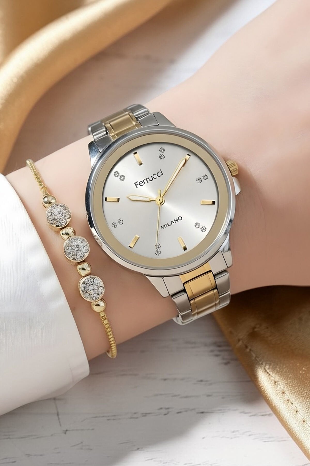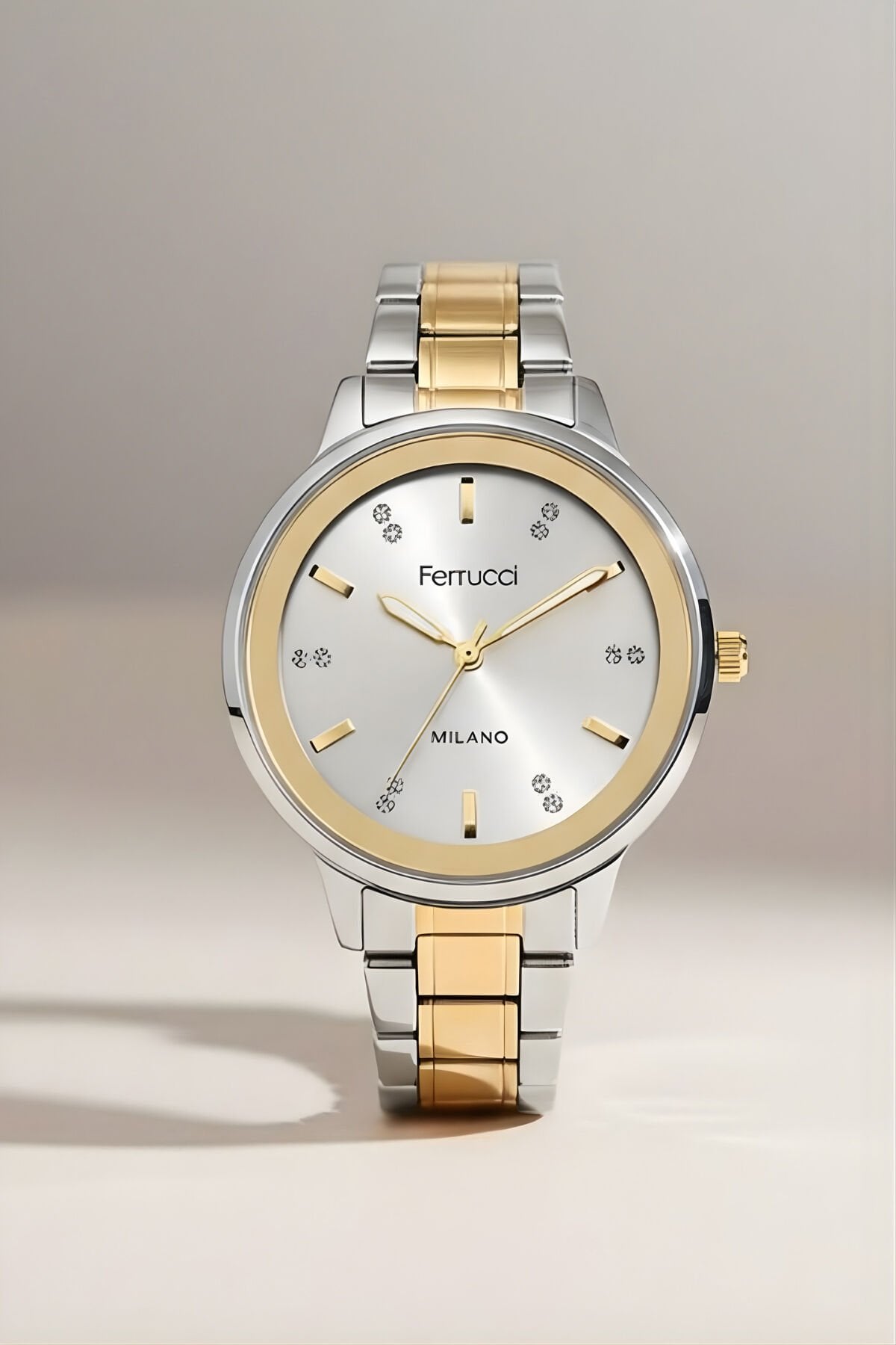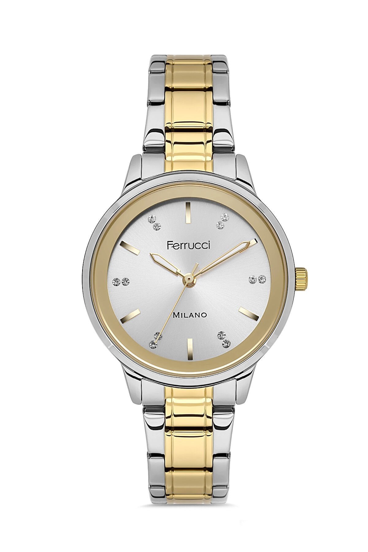 Marka: Ferrucci ; Çap: 33 mm ; Kasa materyali: Metal ; Kordon materyali: Çelik ; Kasa rengi: Altın / Metalik ; Kordon rengi: Altın/ Metalik ; Kadran rengi: Beyaz ; Cam: Mineral ; Ekran tipi: Analog ; Mekanizma: Pilli ; Suya dayanıklılığı: 3 atm (el/yüz yıkama) ; Alarm: Yok ; Kronometre: Yok ; Takvim: Yok ; Orijinal kutusu içerisinde garanti belgesi ile birlikte gönderilecektir. ; Ürün orjinal olup 2 yıl türkiye distribütörü ARIKAN güvencesiyle garantilidir. ;