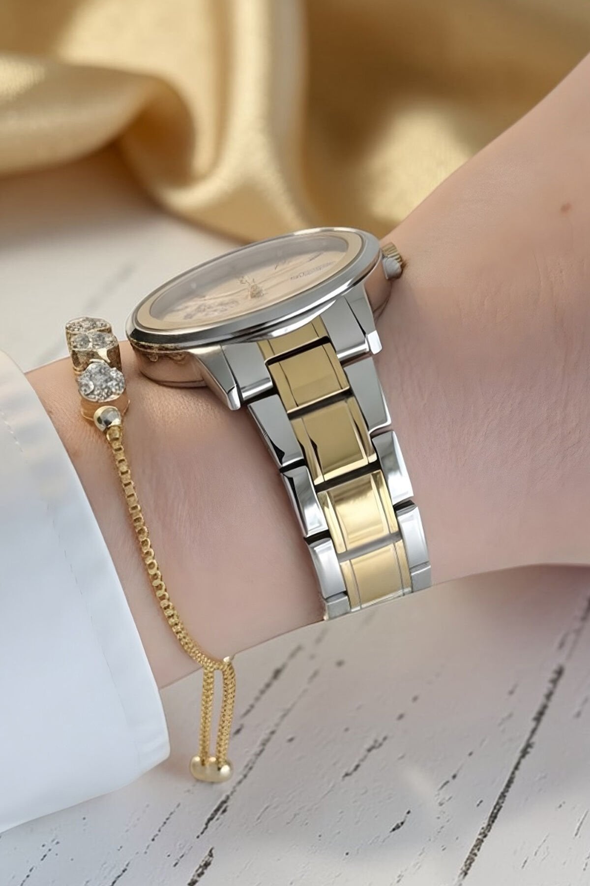 Yeni Mode Çelik Bilezik Altın / Metalik Kadın Kol Saati + Zirkon Taşlı Bileklik