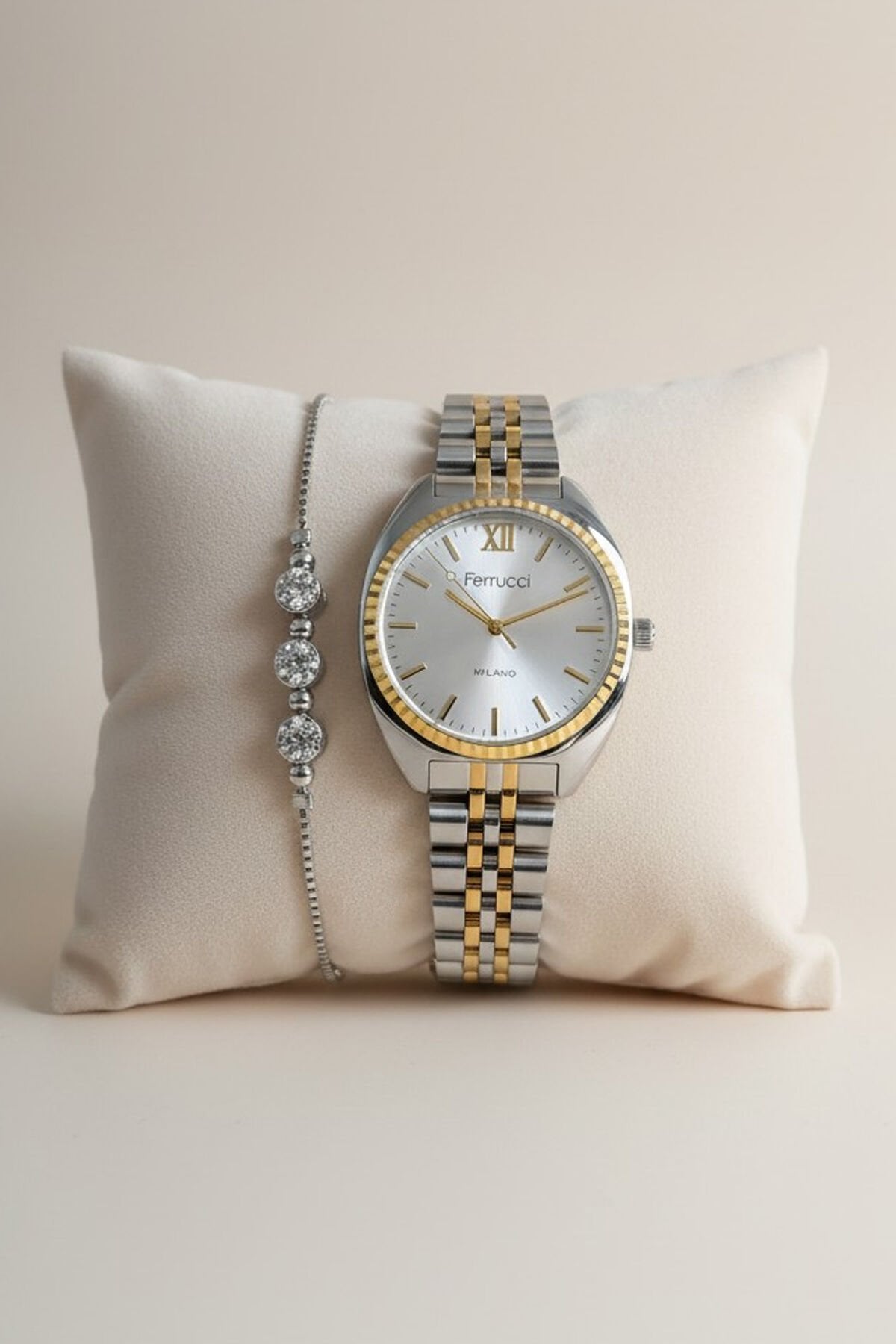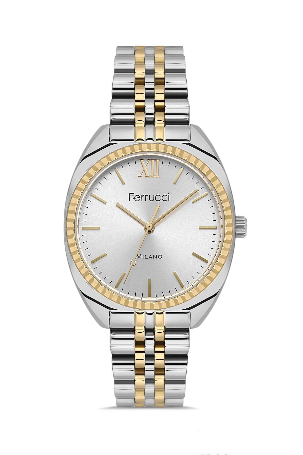 Marka: Ferrucci ; Çap: 34 mm ; Kasa materyali: Metal ; Kordon materyali: Çelik ; Kasa rengi: Altın / Metalik ; Kordon rengi: Altın/ Metalik ; Kadran rengi: Beyaz ; Cam: Mineral ; Ekran tipi: Analog ; Mekanizma: Pilli ; Suya dayanıklılığı: 3 atm (el/yüz yıkama) ; Alarm: Yok ; Kronometre: Yok ; Takvim: Yok ; Orijinal kutusu içerisinde garanti belgesi ile birlikte gönderilecektir. ; Ürün orjinal olup 2 yıl türkiye distribütörü ARIKAN güvencesiyle garantilidir. ;