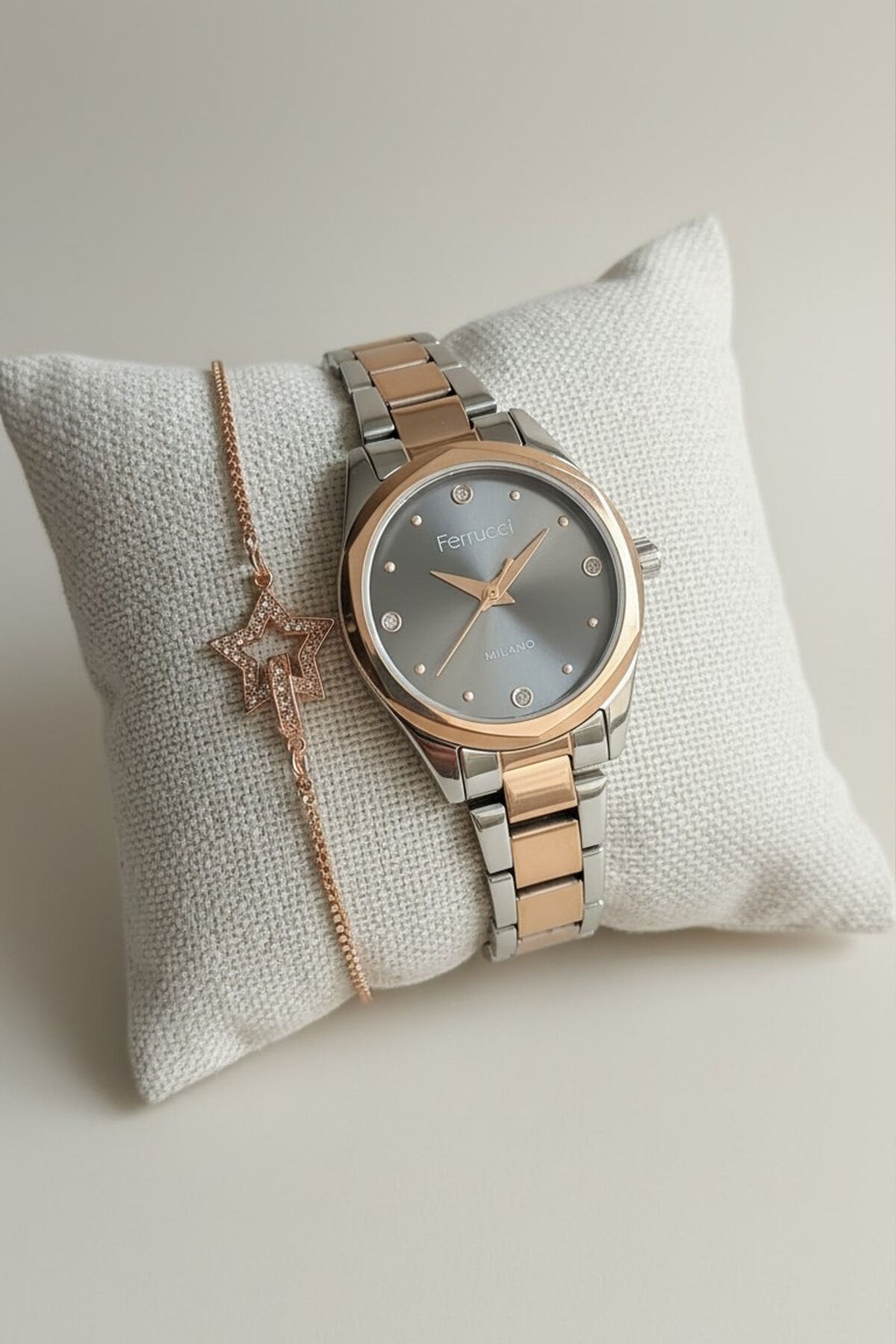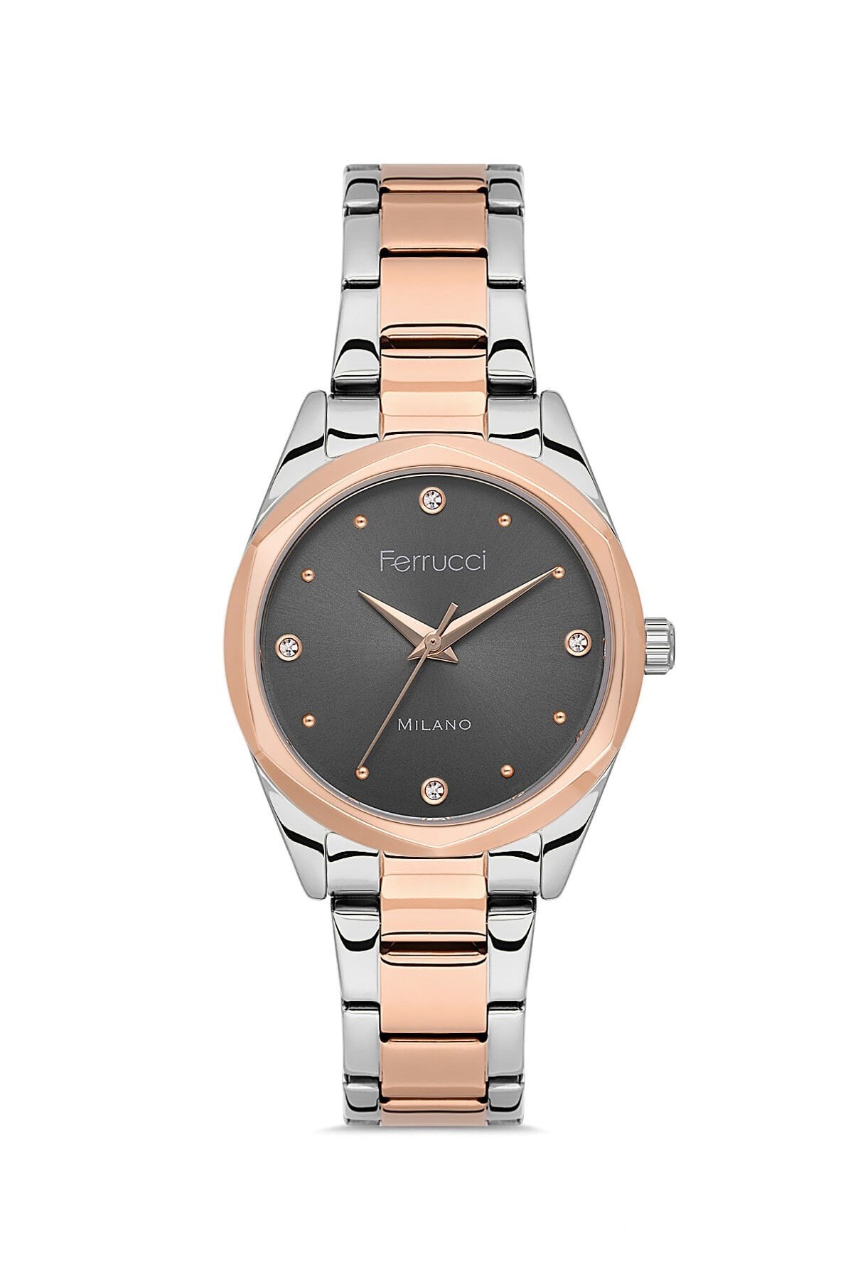 Marka: Ferrucci ; Çap: 32 mm ; Kasa materyali: Metal ; Kordon materyali: Çelik ; Kasa rengi: Rose / Metalik ; Kordon rengi: Rose / Metalik ; Kadran rengi: Kahve ; Cam: Mineral ; Ekran tipi: Analog ; Mekanizma: Pilli ; Suya dayanıklılığı: 3 atm (el/yüz yıkama) ; Alarm: Yok ; Kronometre: Yok ; Takvim: Yok ; Orijinal kutusu içerisinde garanti belgesi ile birlikte gönderilecektir. ; Ürün orjinal olup 2 yıl türkiye distribütörü ARIKAN güvencesiyle garantilidir. ;