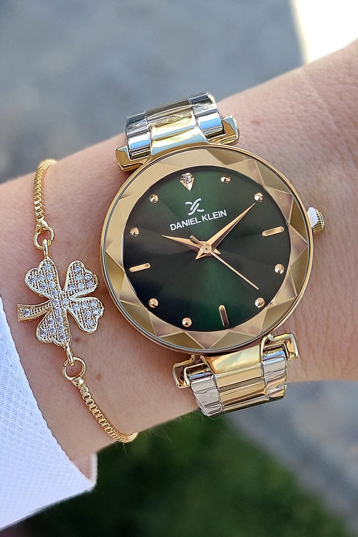 Kesme Camlı 33 mm Altın/Metalik Yeşil Kadran Şık Kadın Kol Saati, Zirkon Taşlı Bileklik Hediyeli